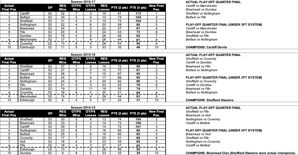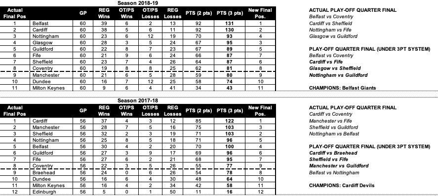Four of the top five places would have switched in a three-points system and while Cardiff Devils would be more than comfortably ahead, Manchester Storm would have finished third rather than second.